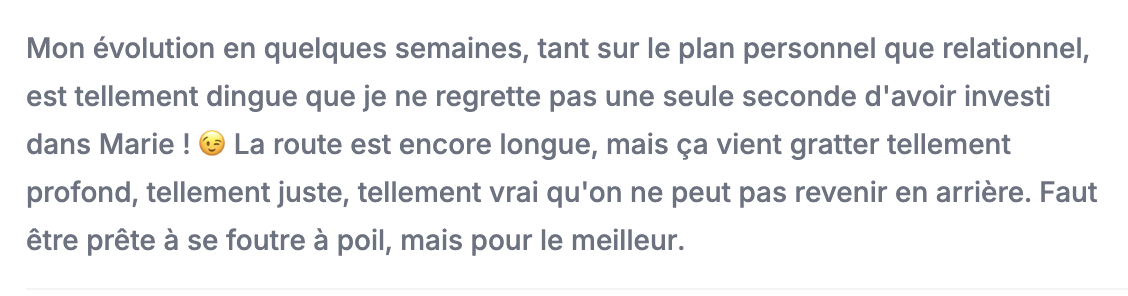 « Marie ne tourne pas autour du pot. Elle n’est pas là pour flatter ou caresser dans le sens du poil. Sa bienveillance est toujours présente, mais elle s’exprime avec vérité et intégrité. Et c’est exactement ce qui rend son accompagnement si puissant. Elle parle vrai, elle transmet avec douceur et ancrage. Une seule de ses questions suffit à provoquer un déclic. No bullshit. Juste du vrai, du profond, du vibrant, et de l’amour.